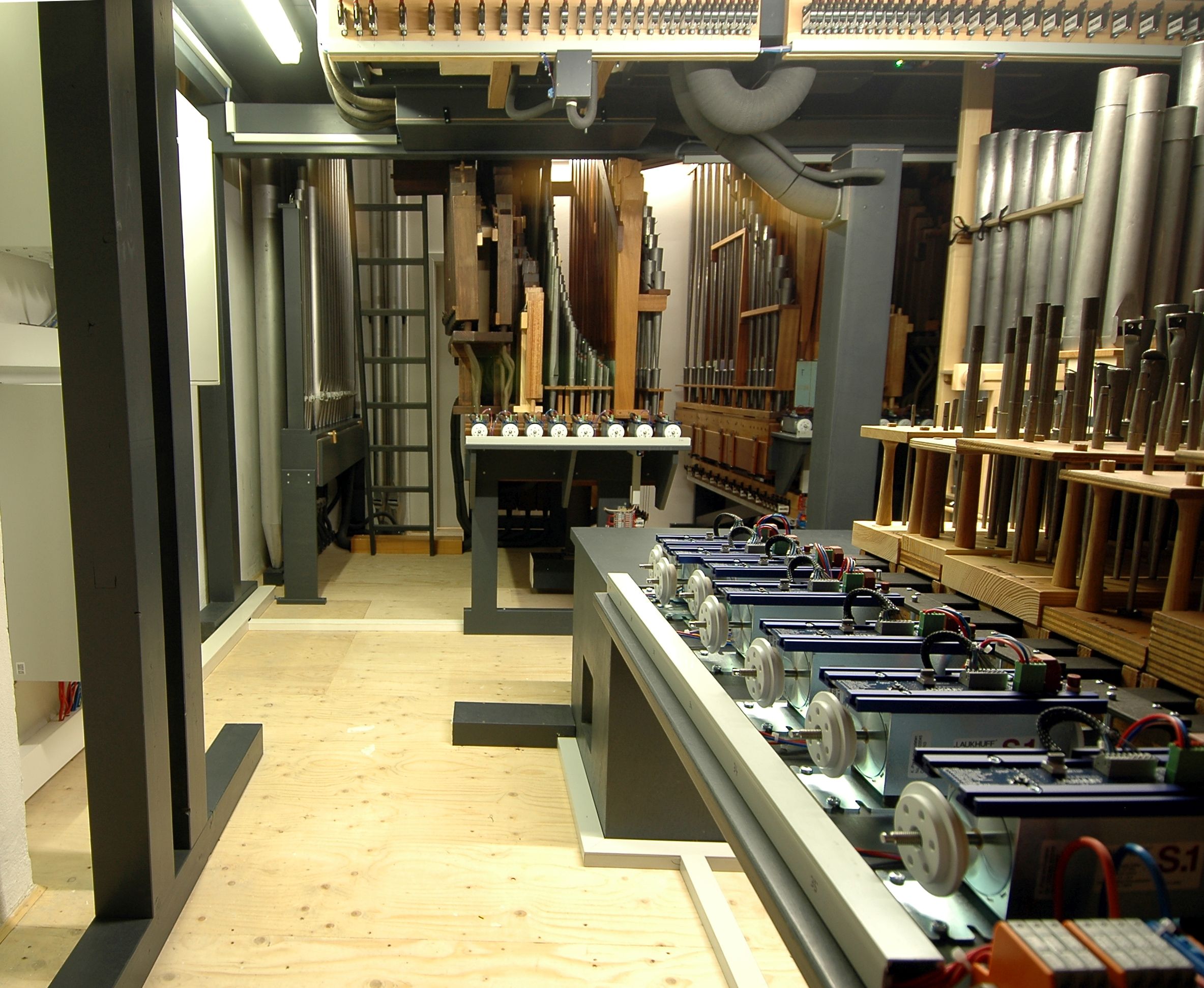 Blick auf das Schwellwerk vom Stimmgang hinter dem Prospekt her.