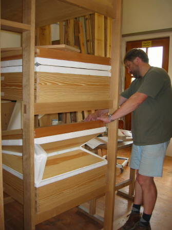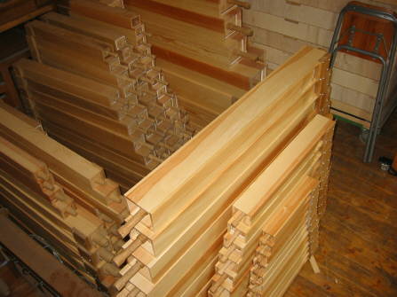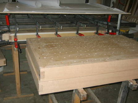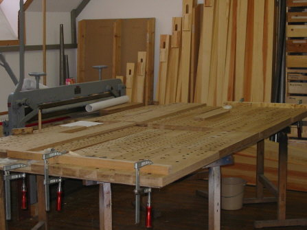![]() Die Holzpfeifen warten in der Werkstatt darauf, in die Orgel eingebaut zu werden. Sie sind aus astfreiem Kiefernholz und Eiche bester Qualität angefertigt. ![]() Die Pfeifenstöcke der beiden Manualwindladen sind in der Werkstatt ausgelegt, um die Pfeifen einzubauen. Im Hintergrund sieht man die Becher der Bombarde 16'. ![]() Die Kanzellenkörper der Windladen werden verleimt. Die Schleifenbohrungen und Ventilschlitze sind bereits vorher gefräst worden. |